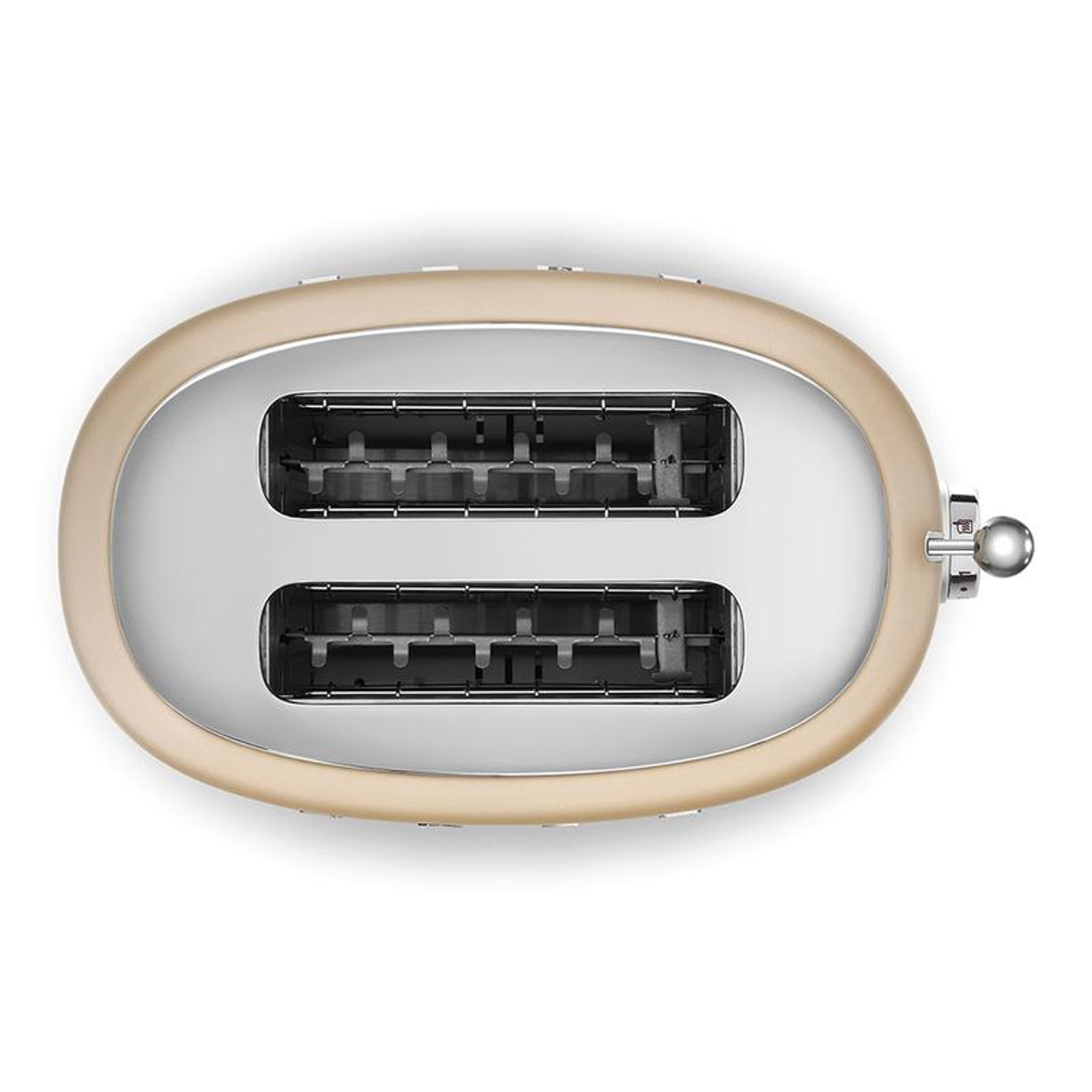 Prepare delicious breakfasts every day with this retro champagne toaster from Smeg. It can brown 2 slices at once and has a reheat function for warming up toast without browning it any further. This model has a bagel function too, leaving one side of your bagel deliciously soft while toasting the other - for the perfect golden finish. You can thaw out frozen bread in no time thanks to the defrost feature. It also has a removable crumb tray, so it's easy to keep clean.